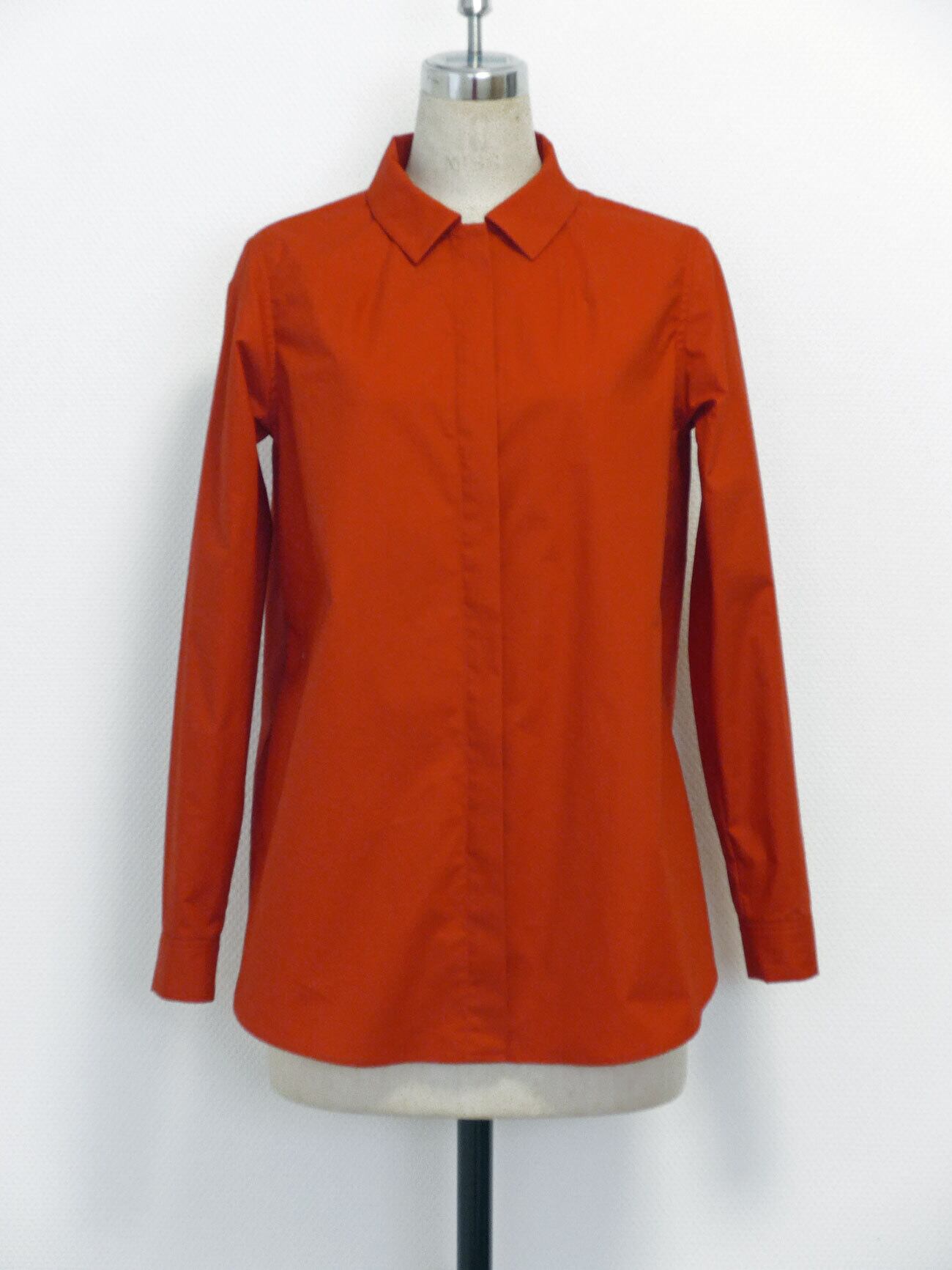 シャツとブラウスの中間のようなイメージで作りましたので、前あきは、比翼仕立てにして、衿は台衿無しの一枚の衿ですが、少し台衿のように立ち上がりがあります。